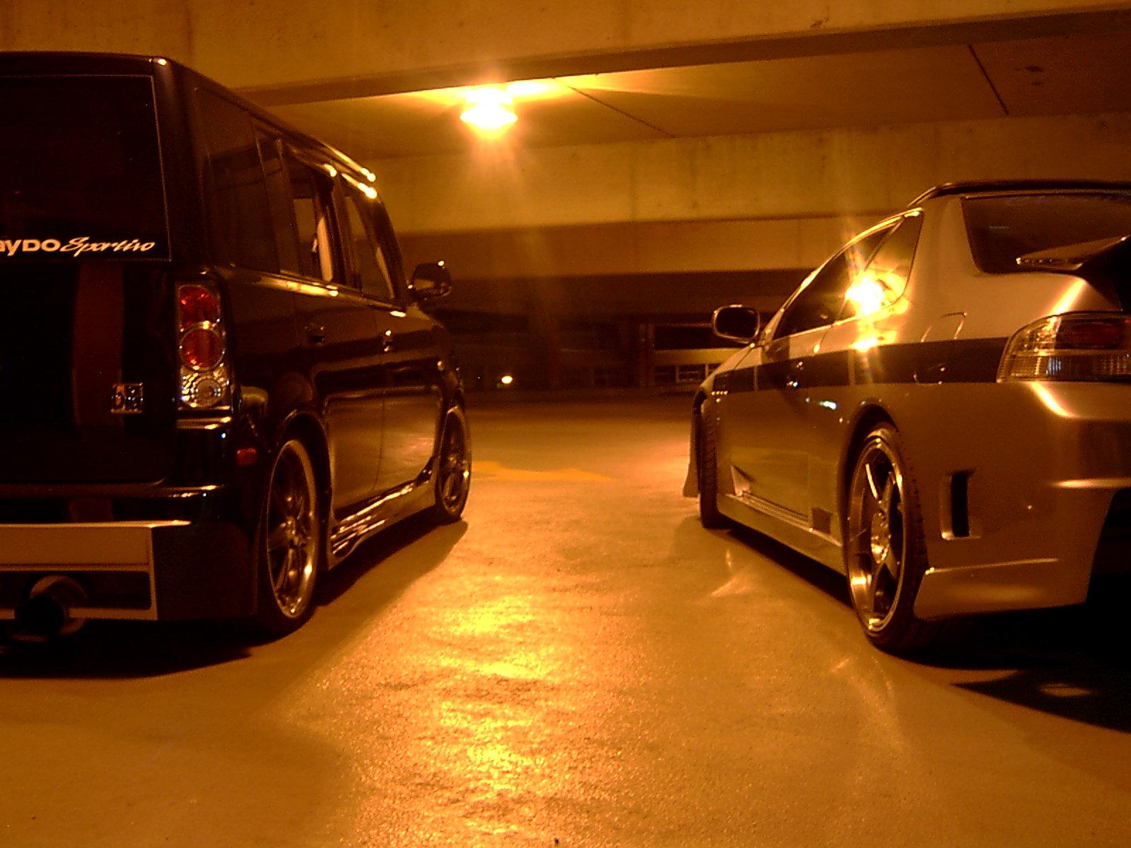 2 cars in the parking garage