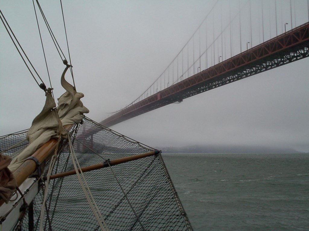 A view of the Golden Gate bridge from a ship sailing into the bay..