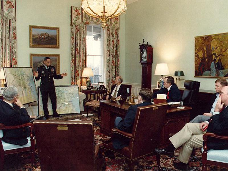 Bush participates in a Gulf War briefing. Public domain.