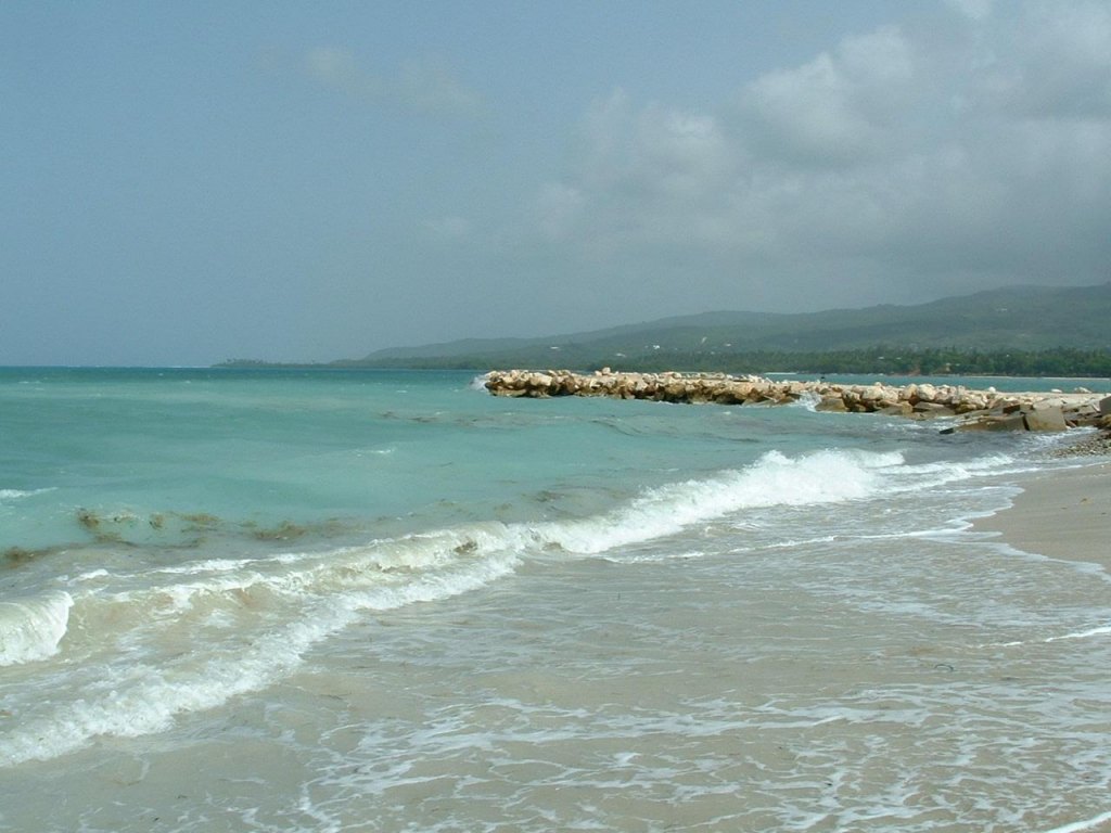 Dominican Republic beach in foreground and mountain in background.
